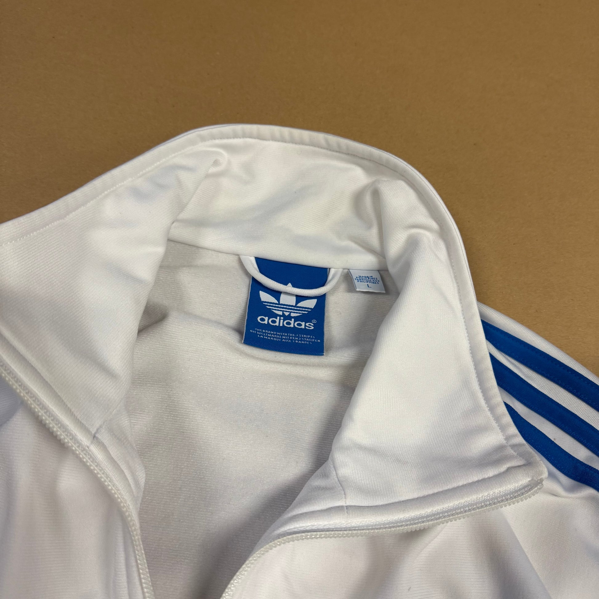 Adidas retro 00s vintage white track jacket, this stylish three-stripes white track jacket features a classic early-2000s design with a relaxed and sporty silhouette, perfect for casual and streetwear outfits. Crafted from polyester, it offers lightweight comfort and durability. Please note that this item is preowned and may show minor signs of wear consistent with use. Item is a size L, please refer to the measurements indicated for accuracy.
