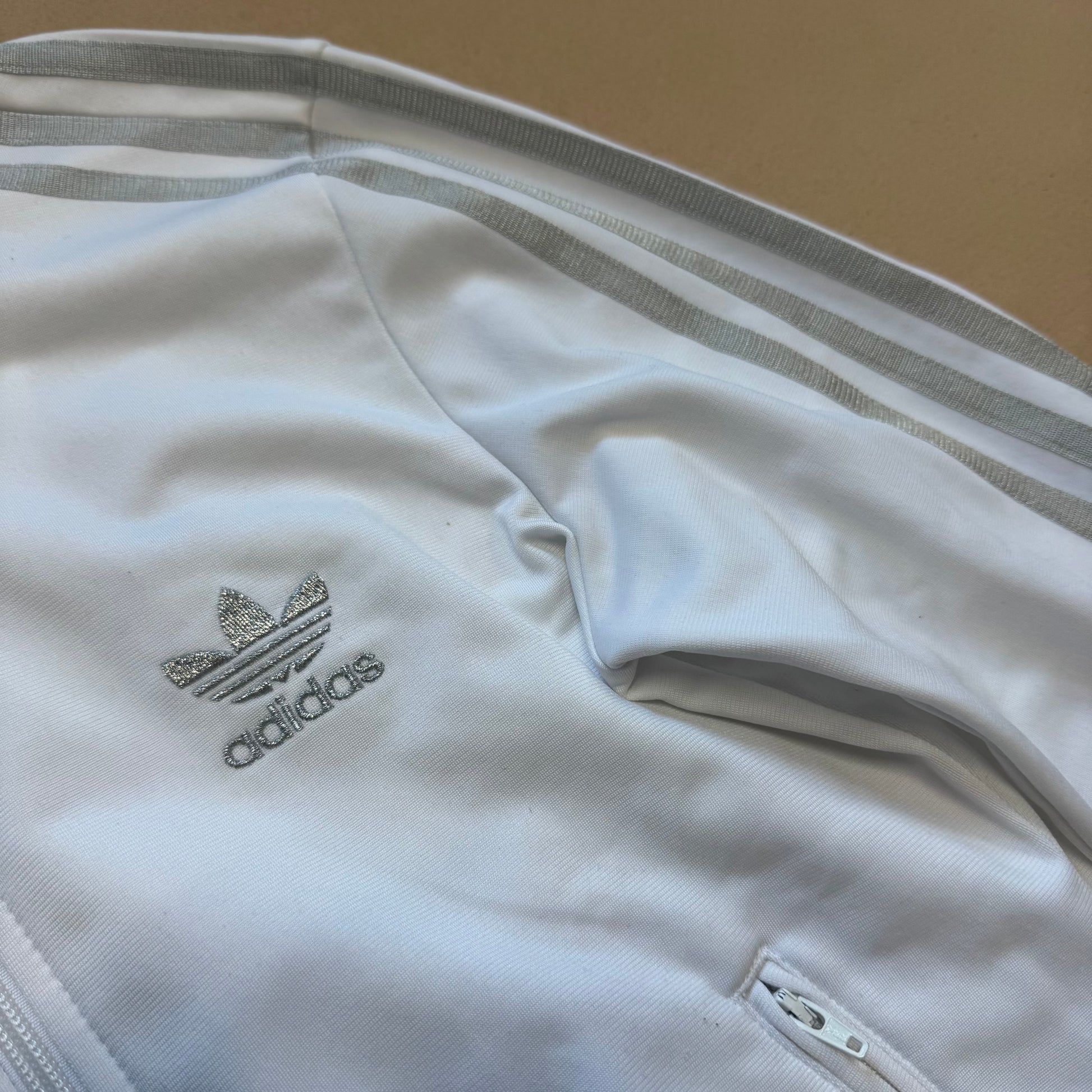 Adidas retro y2k white track jacket, this stylish women’s track jacket features a classic early-2000s look in white polyester with silver details. Please note that this item is preowned and shows minor signs of wear consistent with age. Item is a size M but fits more like an S; please refer to the measurements indicated for accuracy.