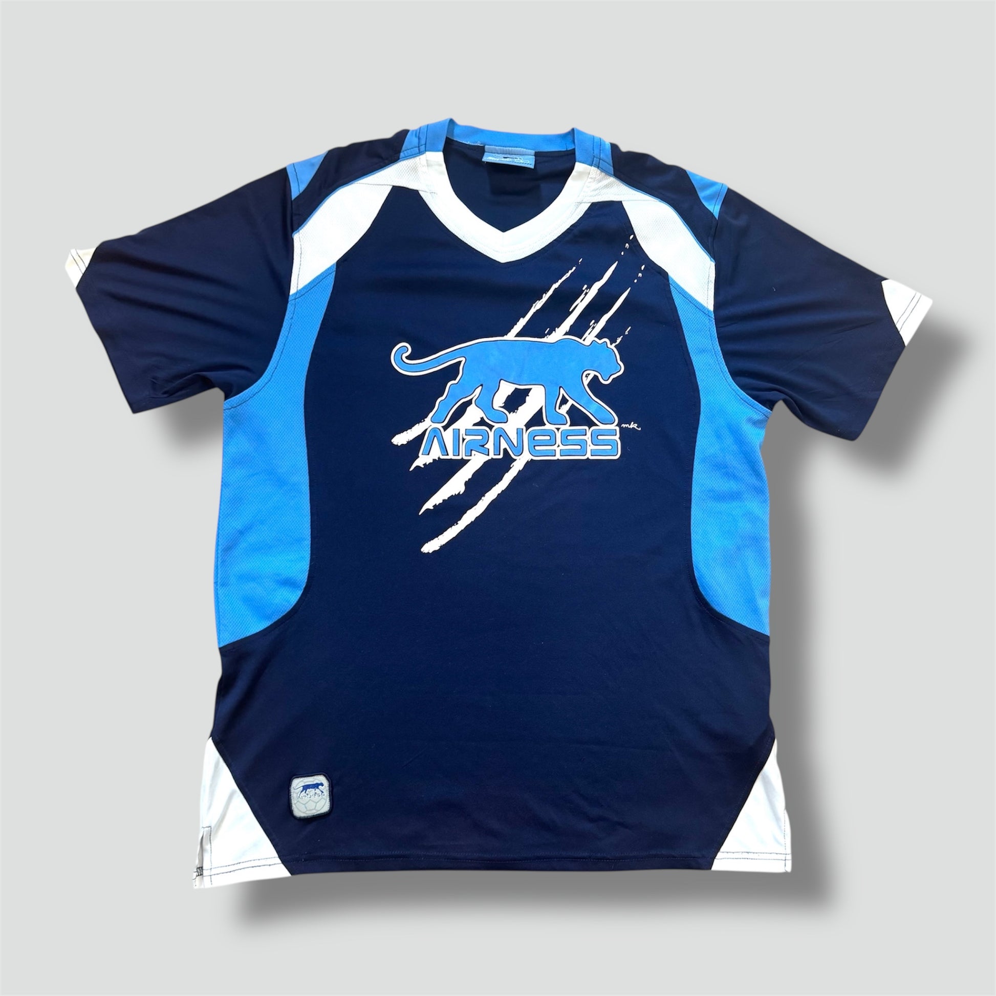 Airness blue streetwear t-shirt, this stylish t-shirt from the panther brand is a true streetwear masterpiece crafted from polyester, combining comfort with bold early 2000s flair. Please note that this item is preowned and shows signs of wear. Item is a size L, please refer to the measurements indicated for accuracy.