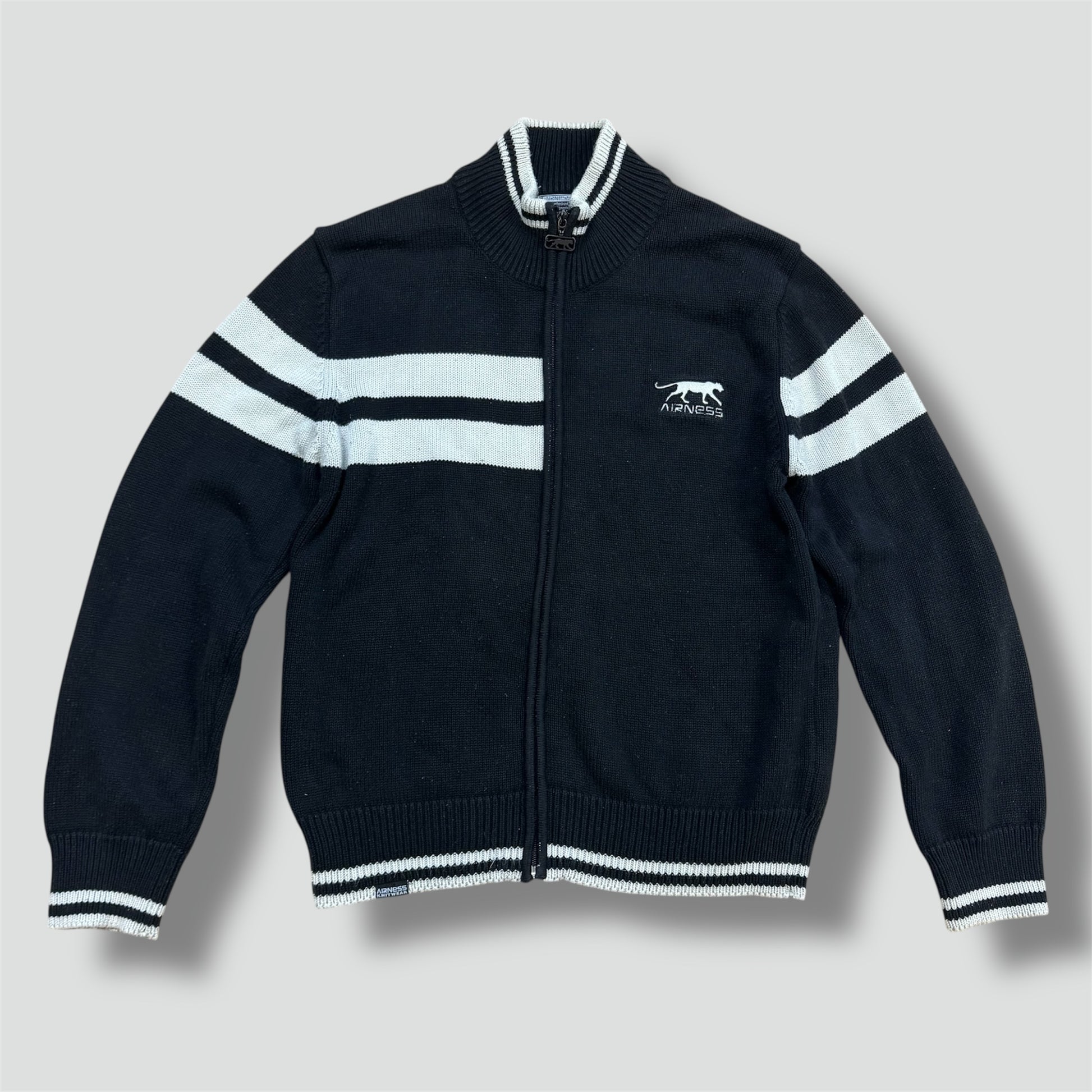 Airness vintage black knitted jacket, this stylish knitted zip-up from the French streetwear brand offers a sleek and versatile look, perfect for layering in casual outfits. Made from cotton, it provides comfort and durability. Please note that this item is preowned and may show minor signs of wear consistent with its age. Item is a size M, please refer to the measurements indicated for accuracy.