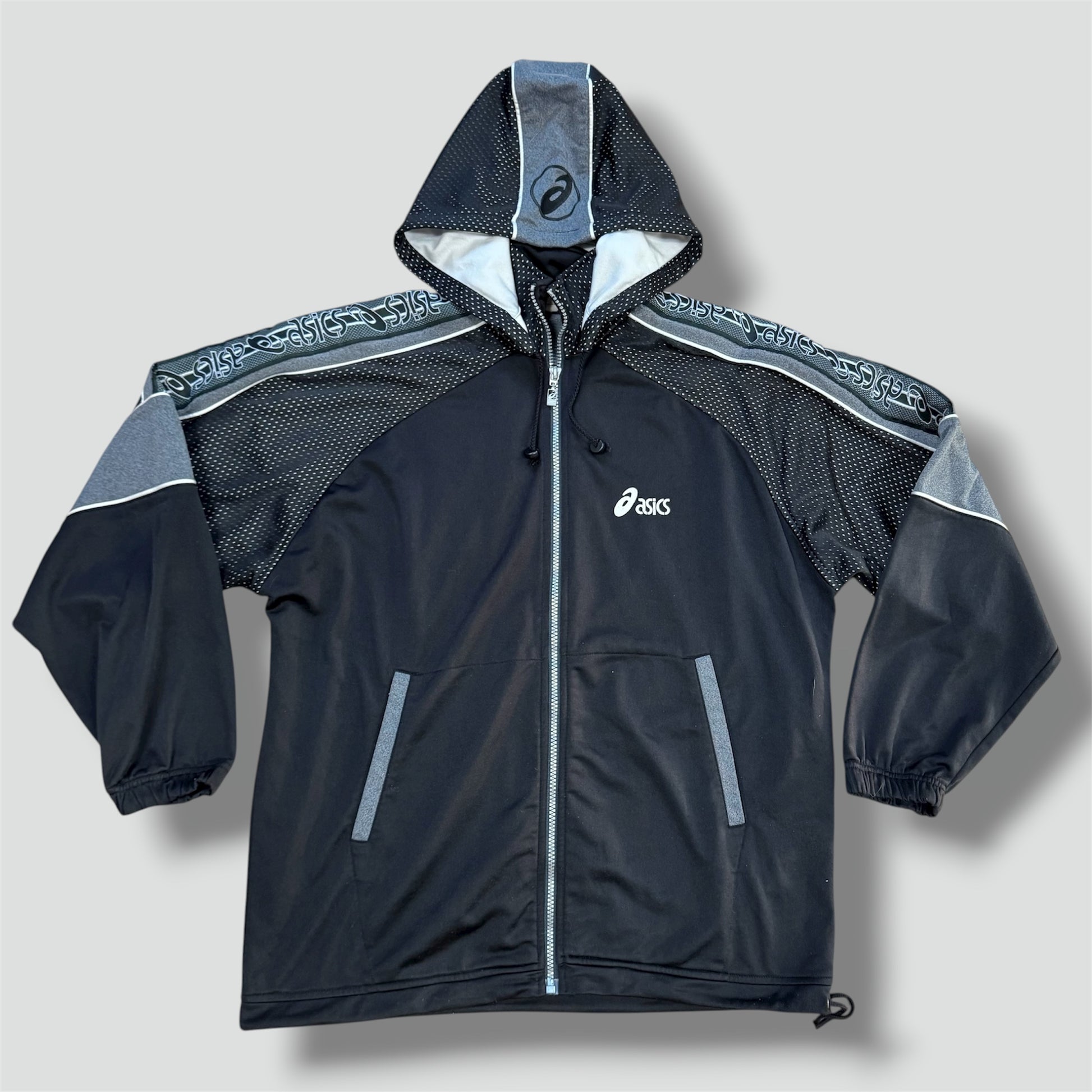 Asics black Streetwear style zip-up hoodie, this stylish track jacket-like hoodie crafted from sporty polyester, offers a comfortable and casual look perfect for everyday wear. Please note that this item is preowned and shows minor signs of wear consistent with its age. Item is a size L, please refer to the measurements indicated for accuracy.