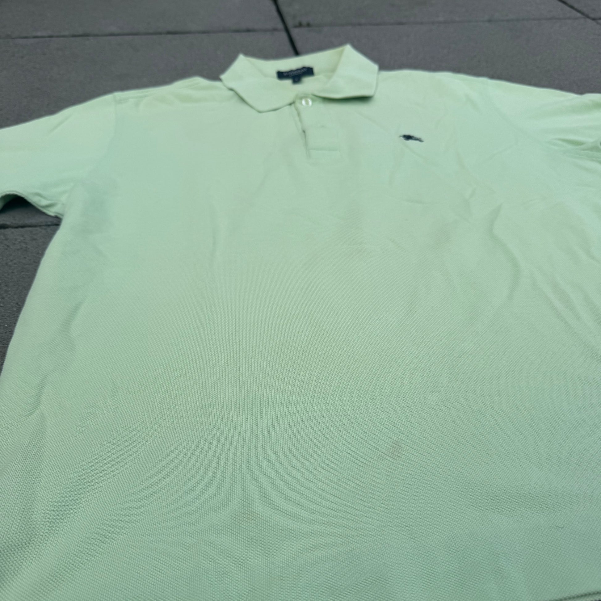 Burberry London mint-green poloshirt, this stylish vintage polo is a refined piece with a timeless appeal. Please note that this item is preowned and shows signs of wear, including minor discoloration. Item is a size 5, fitting an L, please refer to the measurements for accuracy.