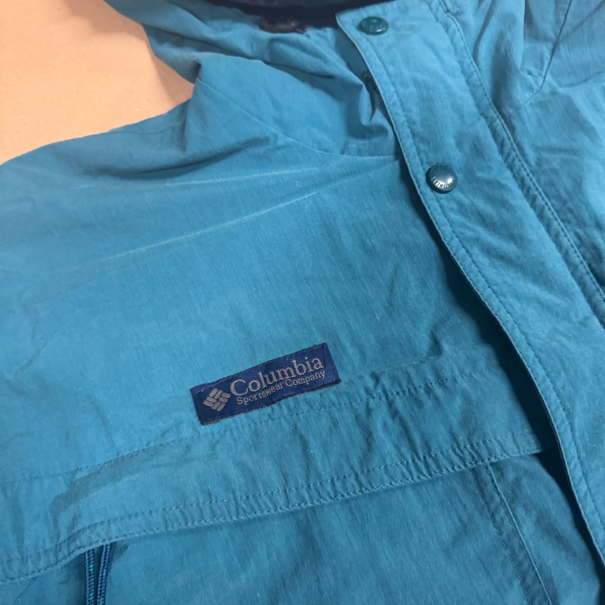 Columbia turquoise raincoat, this stylish casual rain jacket from Columbia is a functional and fashionable addition to your outdoor or streetwear wardrobe. Crafted from durable polyester, it offers great protection against light rain while maintaining comfort and breathability. Please note that this item is preowned and shows minor signs of wear. Item is a size L with a loose fit, please refer to the measurements for accuracy.