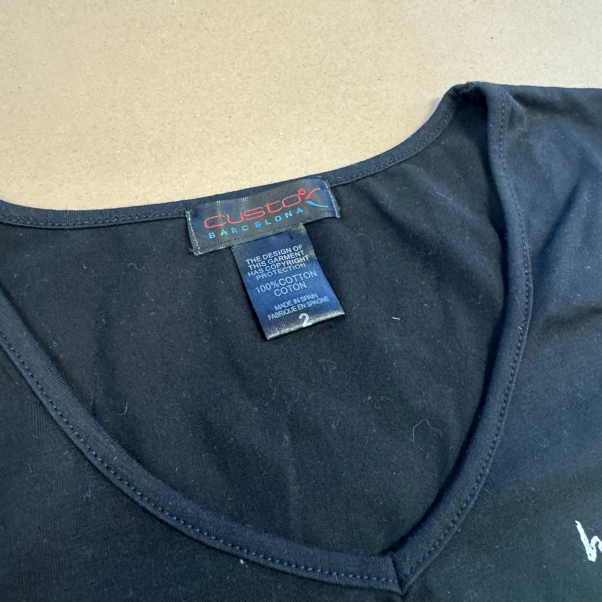 Custo Barcelona Y2K butterfly glitter t-shirt, this stylish women’s summer t-shirt in black features a bold butterfly design with glitter details, making it a standout early-2000s piece. Crafted from cotton, it offers a comfortable feel with a flattering fit. Please note that this item is preowned and may show minor signs of wear consistent with use. Item is a size 2, fitting a women’s size S, please refer to the measurements indicated for accuracy.