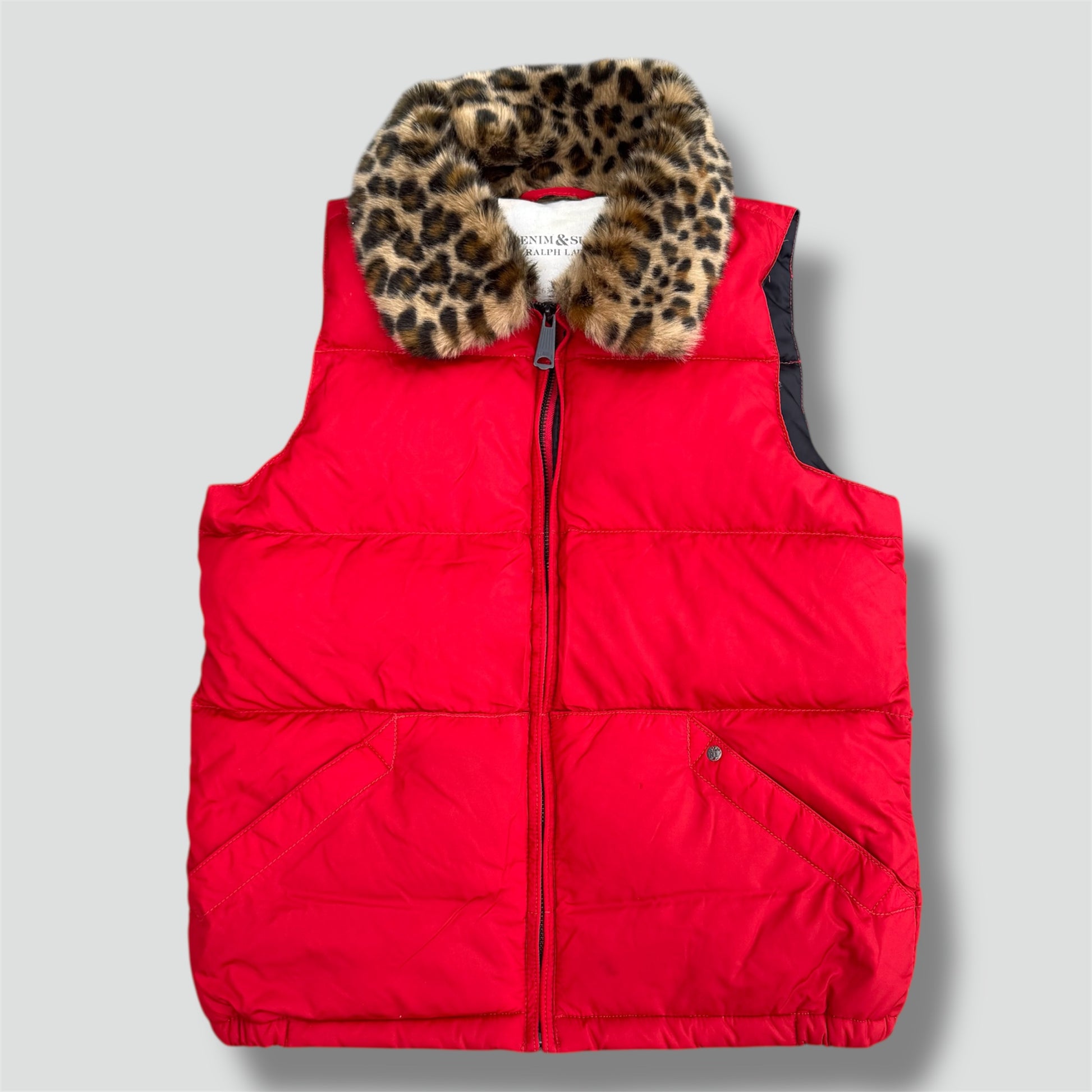 Denim & Supply Ralph Lauren red vest, this stylish vest in a shiny red tone with a fur-like neck band is a standout Y2K-inspired piece for women. Please note that this item is preowned and may show minor signs of wear. The vest is not very warm and is crafted from a polyester and nylon blend. Item is a size S, please refer to the measurements indicated for accuracy.