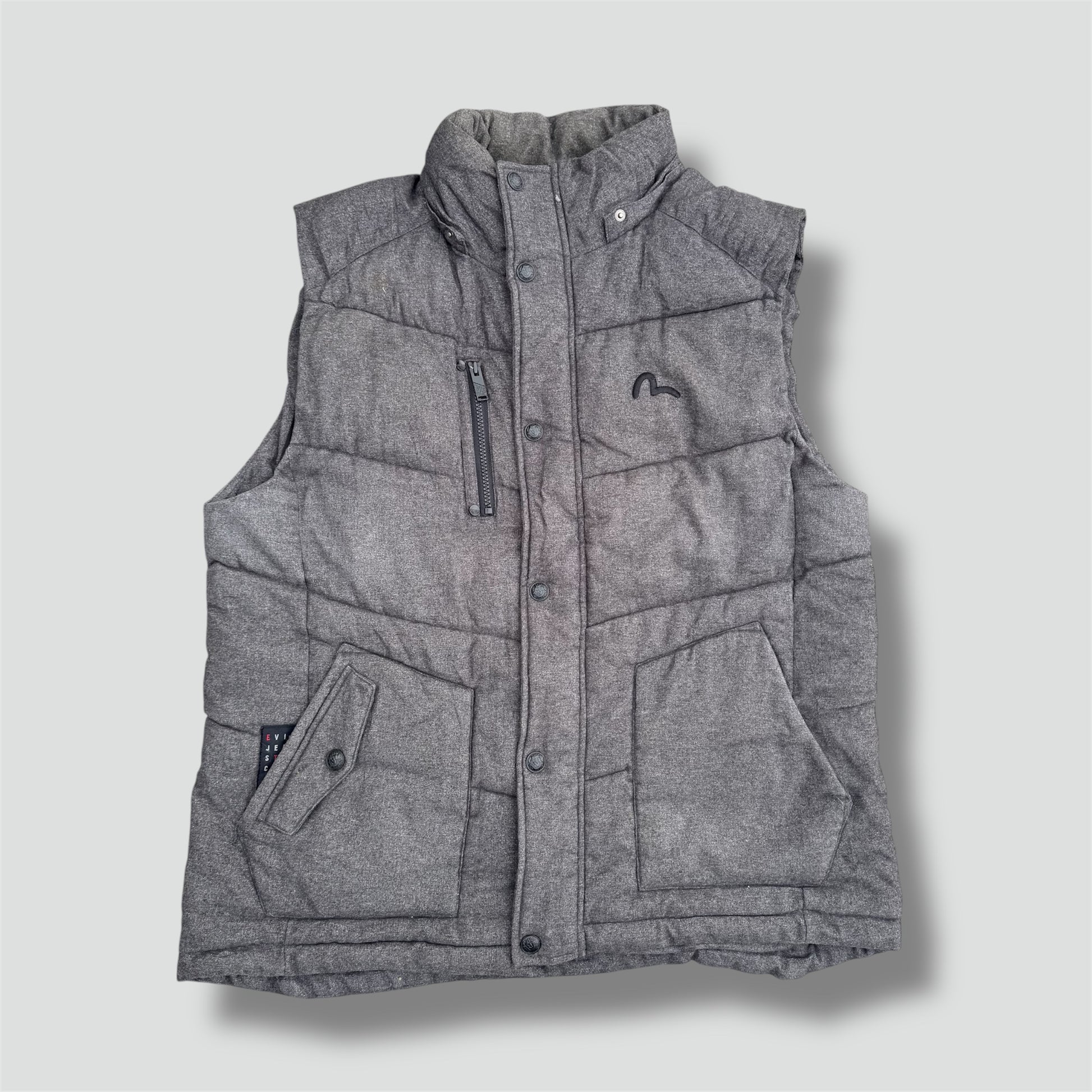 Evisu grey winter vest, this stylish Japanese streetwear piece crafted from cotton is a perfect item for the pre-winter season. Please note that this item is not waterproof. The vest is preowned and shows signs of wear and use. Item is a size M with a loose fit for men, please refer to the measurements indicated for accuracy.