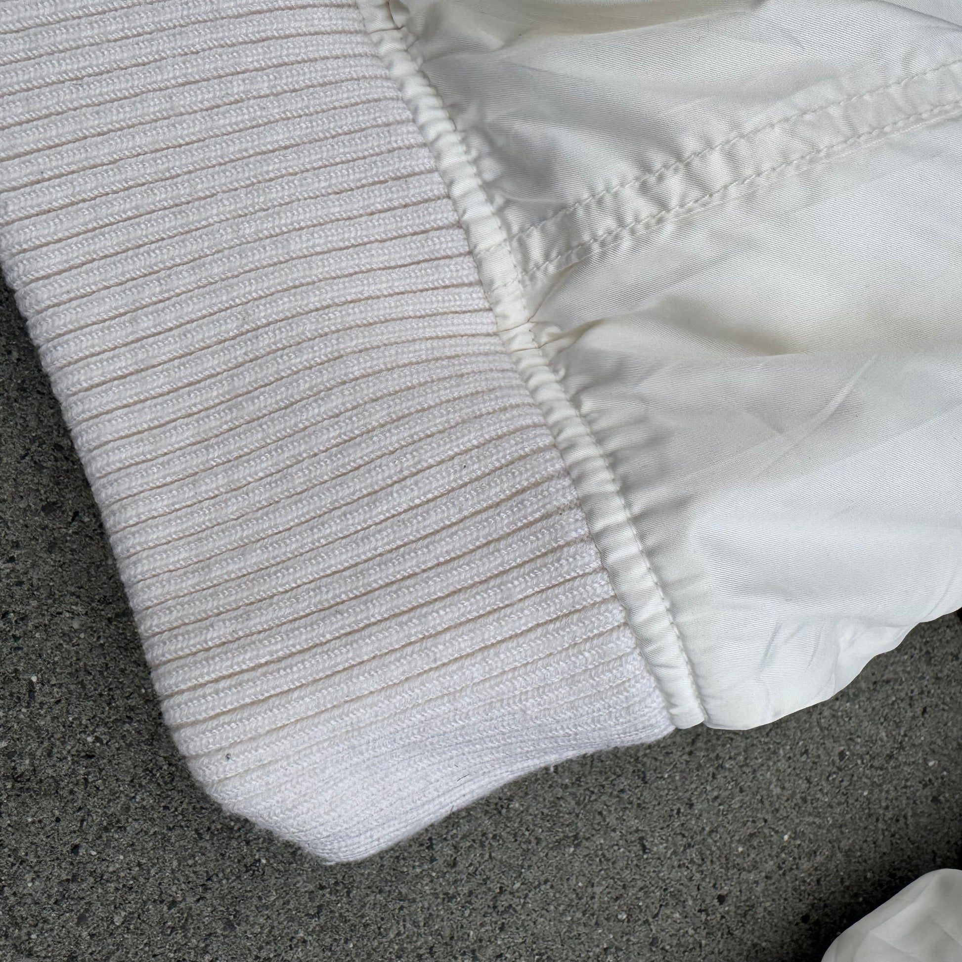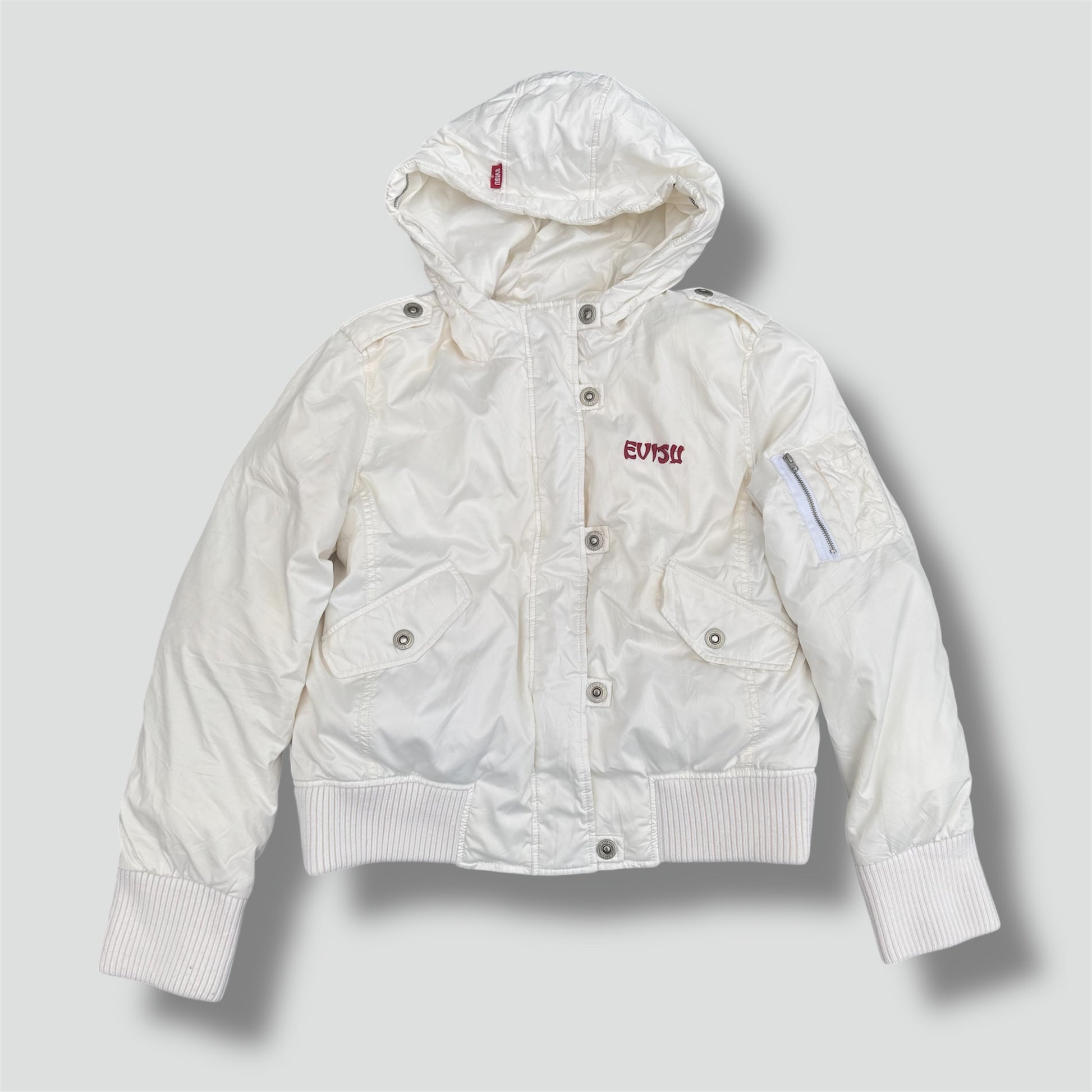 Evisu white women’s winter jacket, this stylish puffer jacket from the Japanese streetwear brand Evisu features a full zip and a hood, combining warmth with a sleek streetwear look. Please note that this item is preowned and shows minor signs of wear consistent with its age. Item is a women’s size L, please refer to the measurements indicated for accuracy.