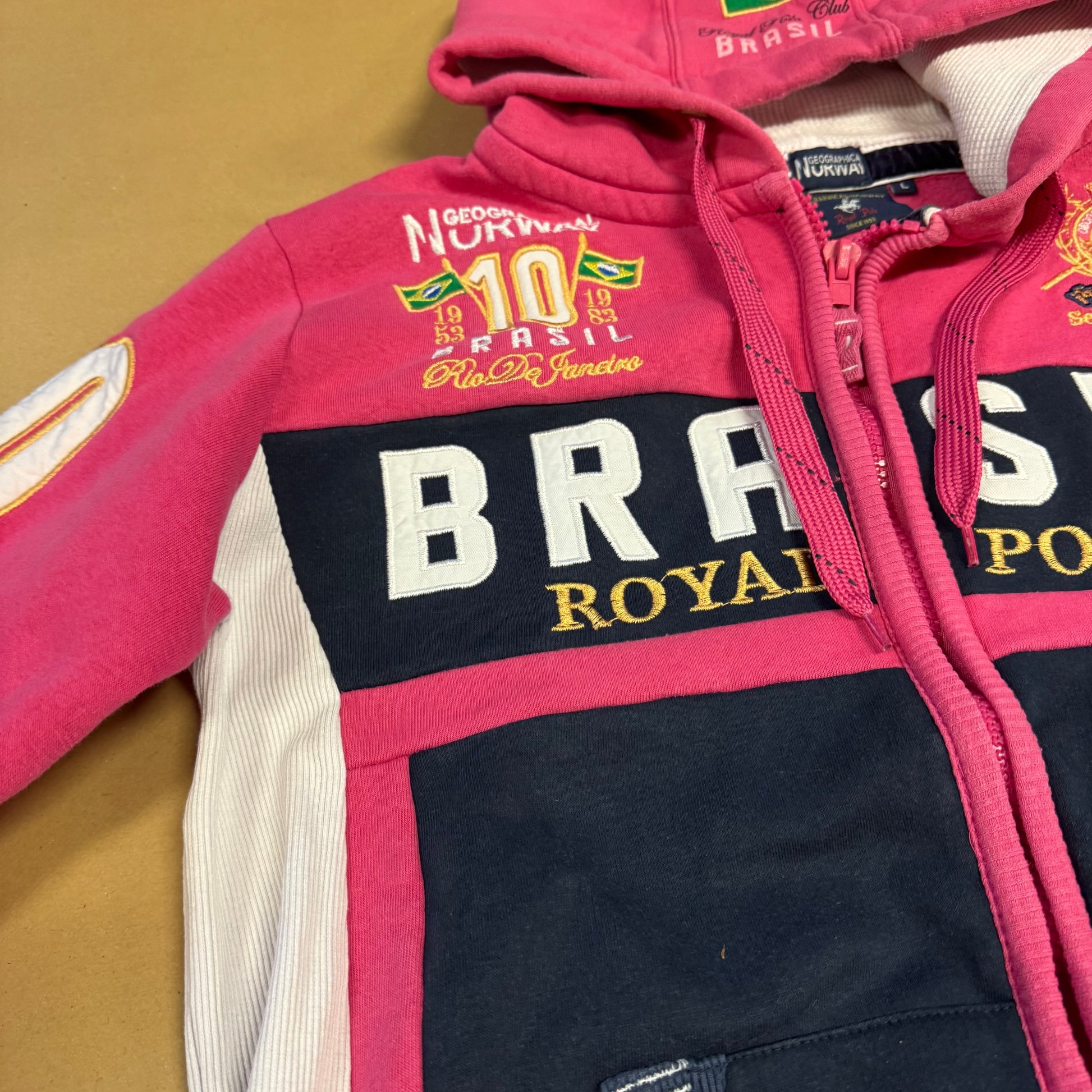 Geographical Norway Brazil Royal Polo hoodie, this stylish retro vintage colorful pink zip-up hoodie is crafted from thick cotton, offering warmth and a soft, comfortable feel. Its vibrant design makes it a standout piece for casual and sporty outfits. Please note that this item is preowned and may show minor signs of wear consistent with use. Item is a size L with a slim fit, please refer to the measurements indicated for accuracy.