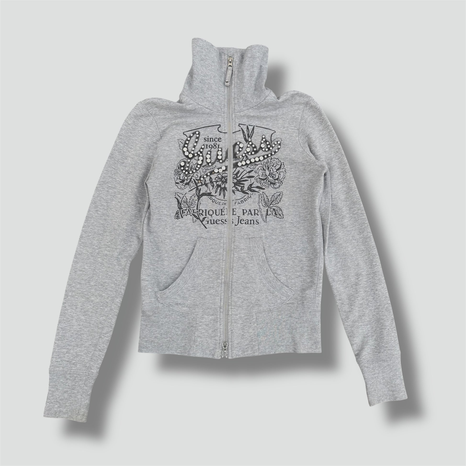 Guess Erique Par vintage rhinestones zip-up, this stylish grey Y2K zip-up jacket is a standout vintage piece with iconic rhinestone detailing. Please note that this item is preowned and shows minor signs of wear. Two rhinestones are missing, but the rest are in very good condition. Item is a size XS, please refer to the measurements below: