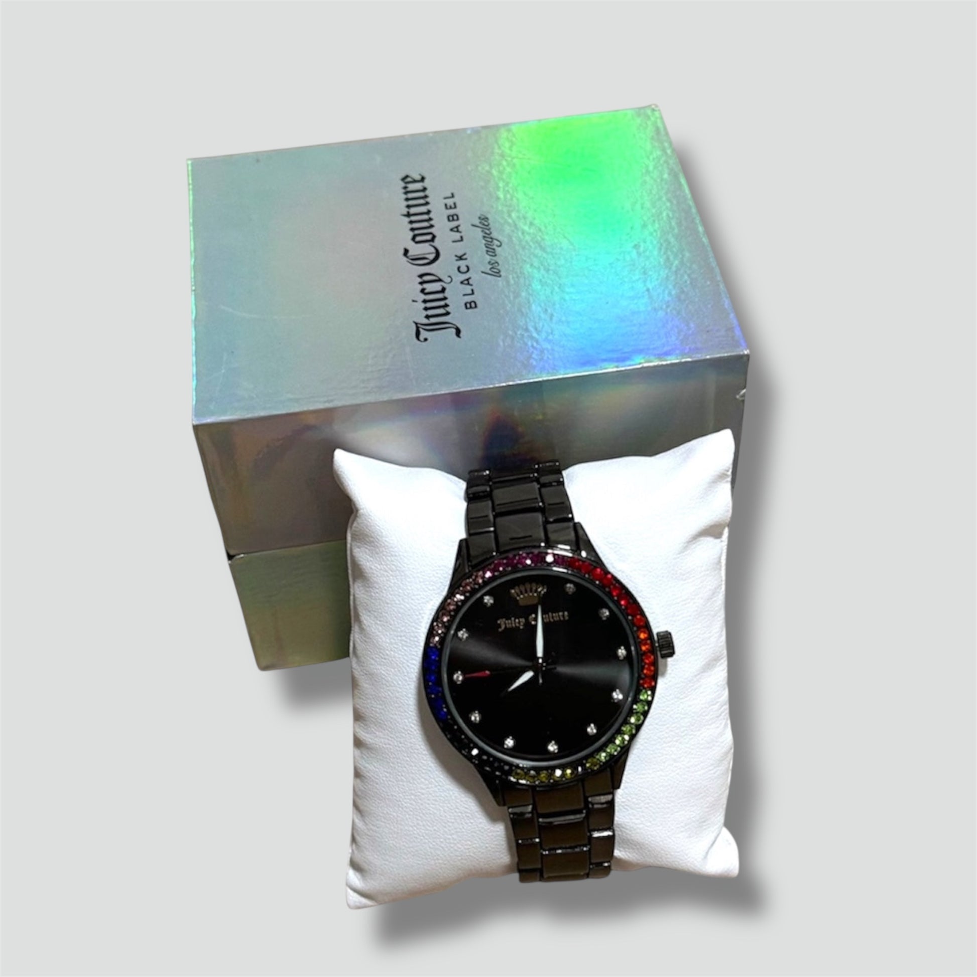 Juicy Couture Los Angeles Black Label watch with rhinestone details, offering a touch of glamour and sophistication. This stylish accessory features an adjustable band for a perfect fit. The battery may not be fully charged, so please consider a replacement for optimal use. An iconic piece for those looking to add a statement watch to their collection, combining both luxury fashion and Y2K vibes