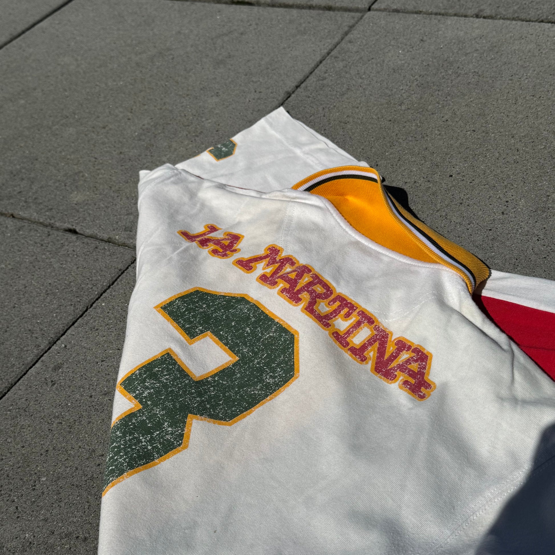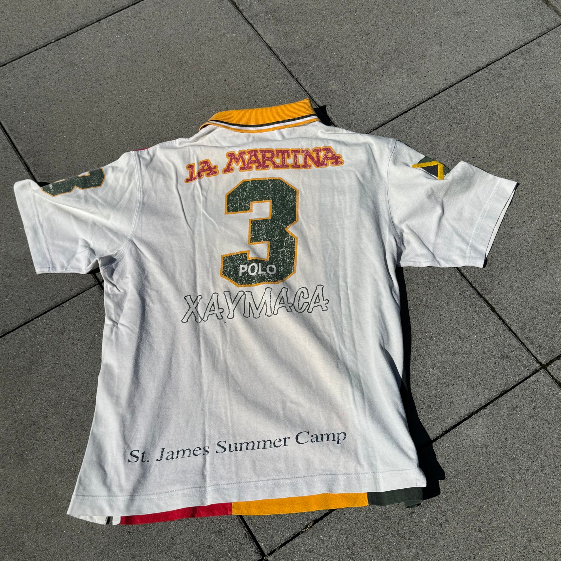 La Martina Montenegro Bay poloshirt, this stylish streetwear piece with bold colors is a very limited vintage item with history. Please note that this item is preowned and may show minor signs of wear. Item is a size L, please refer to the measurements indicated for accuracy.