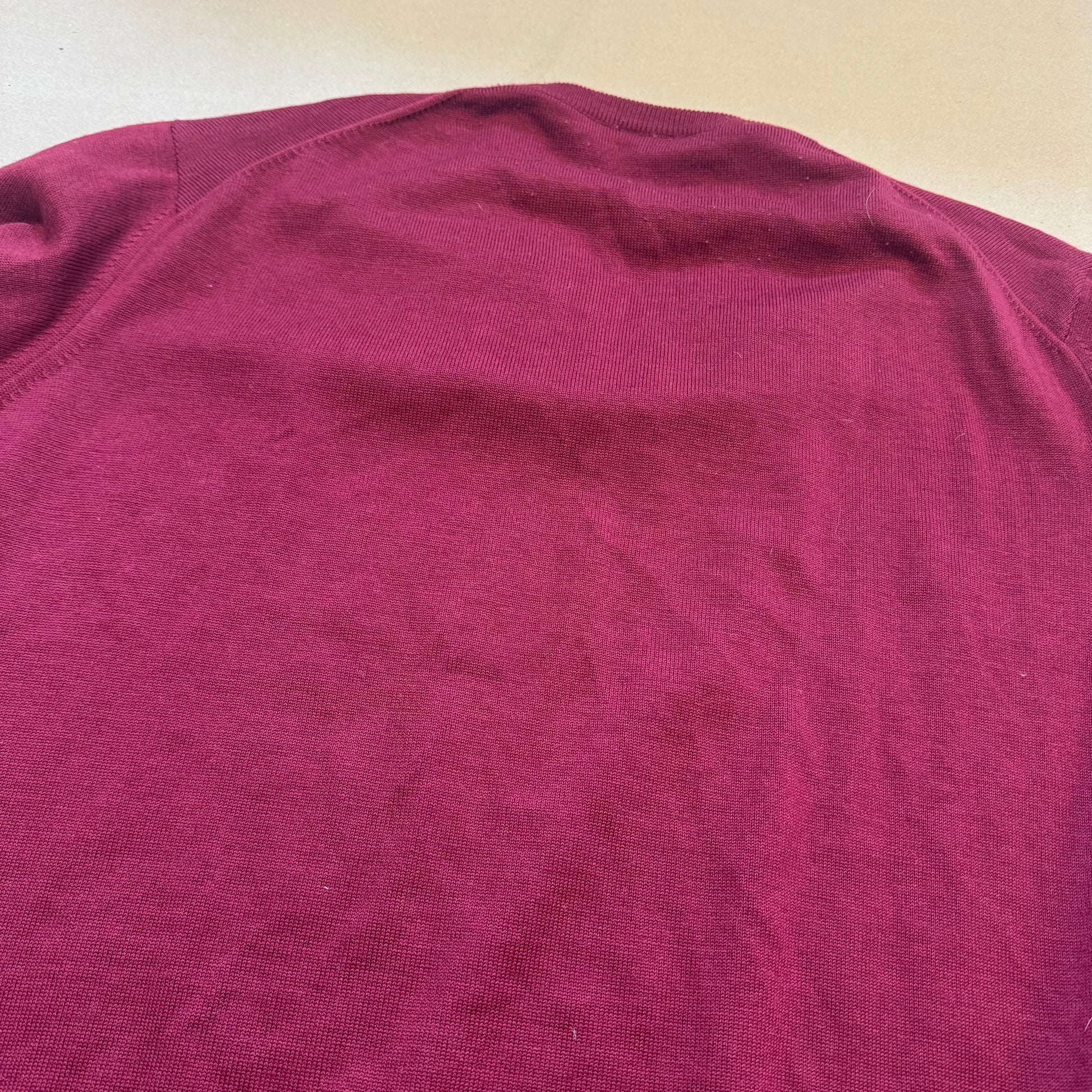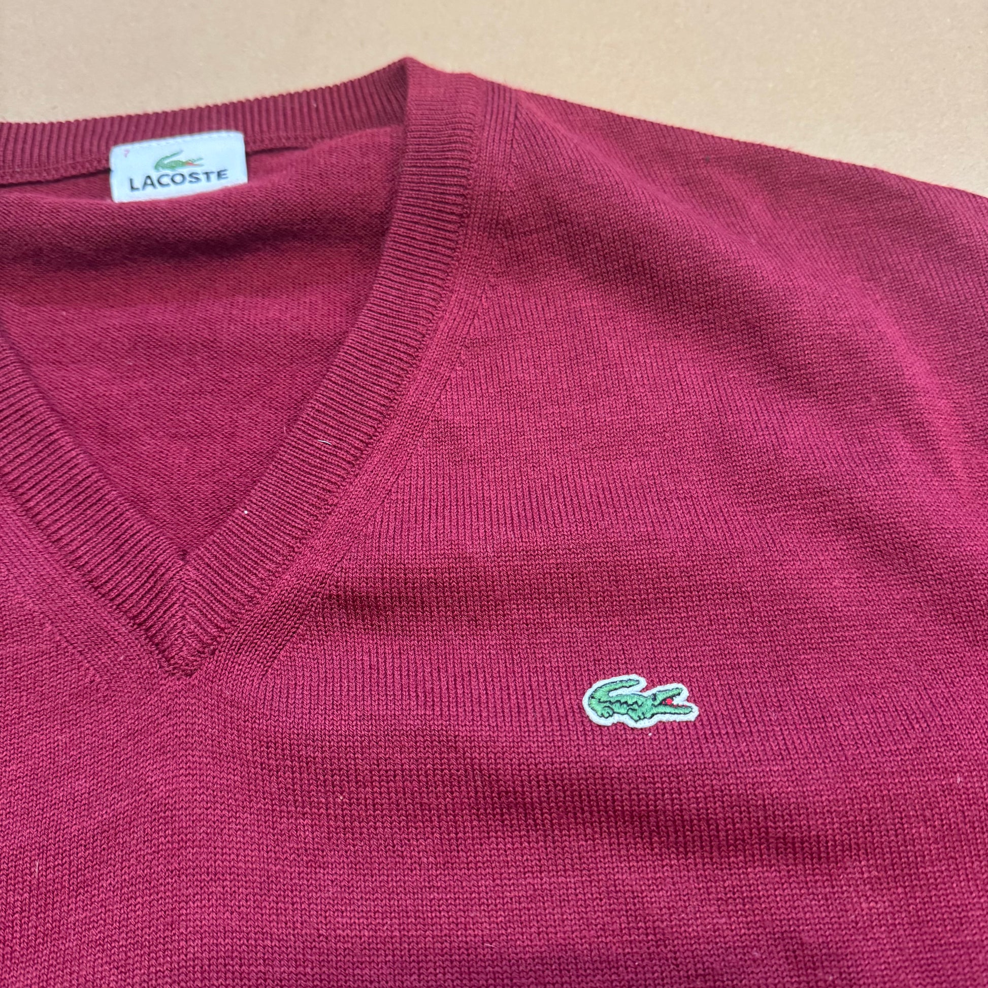 Lacoste vintage burgundy v-neck sweater, this stylish wool-made knit is a timeless classic, perfect for adding a refined vintage touch to your wardrobe. Crafted from warm, quality wool in a deep burgundy shade. Please note that this item is preowned and may show minor signs of wear. Item is a size 7, fitting a men’s L, please refer to the measurements indicated for accuracy.