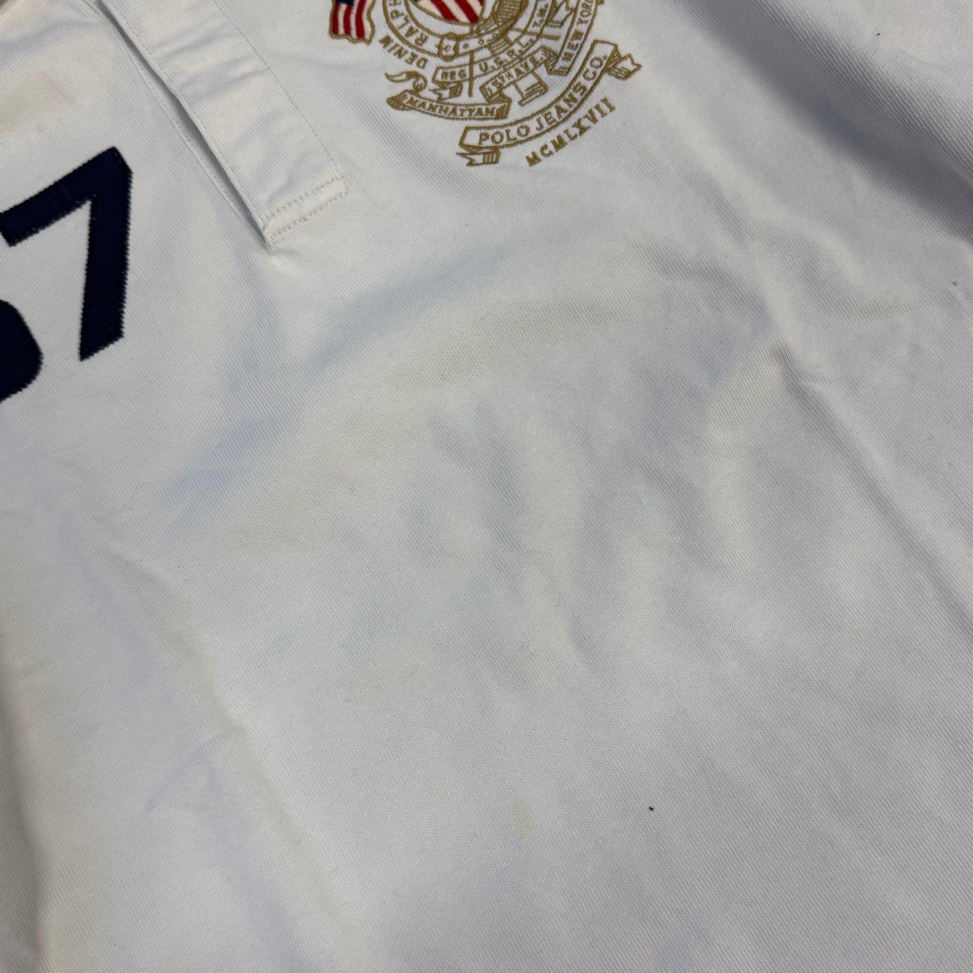 Polo Ralph Lauren Jeans 6 7 six seven white long sleeve, this stylish long sleeve polo shirt features a classic design with a clean and timeless look, perfect for casual and preppy outfits. Crafted from cotton, it offers a soft and comfortable feel with a relaxed fit. Please note that this item is preowned and may show minor signs of wear consistent with use. Item is a size M with a loose fit, please refer to the measurements indicated for accuracy.