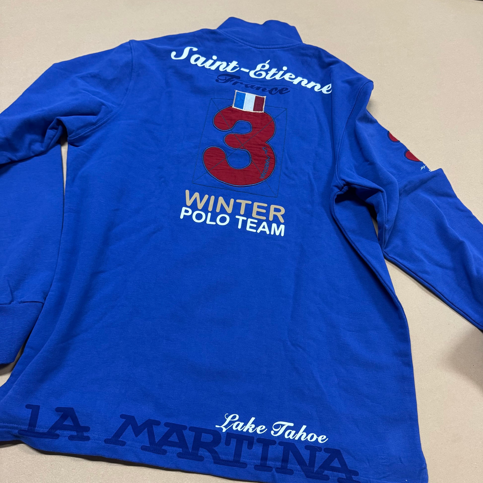 Rhone Alpes St. Etienne La Martina sweater, this stylish sweatshirt with a quarter zip and elegant embroidered details is a true vintage gem from the La Martina collection, combining comfort with refined design. Please note that this item is preowned and may show minor signs of wear. Item is a size L, please refer to the measurements indicated for accuracy.