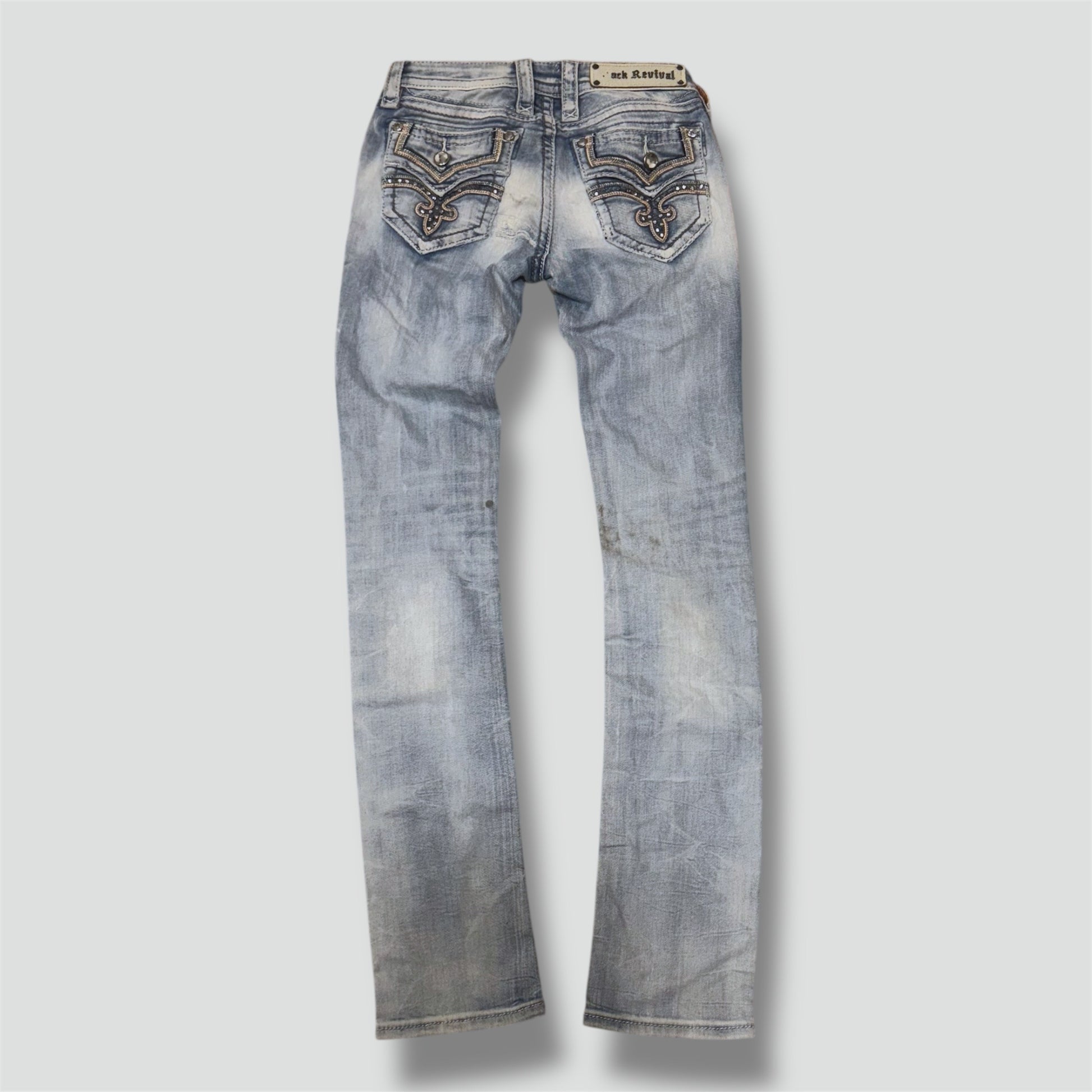 Rock Revival y2k vintage women’s denim jeans, these stylish rhinestone-embellished y2k denim jeans from the American designer brand Rock Revival feature a bold and eye-catching design. Crafted from denim, they offer structure and a standout retro aesthetic. Please note that this item is preowned and shows clear signs of wear and use. Item is a size 24, please refer to the measurements indicated for accuracy.