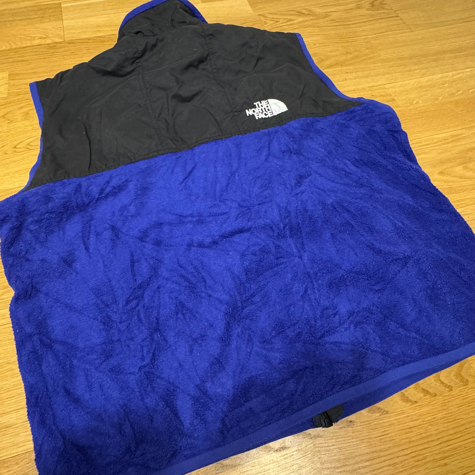 The North Face purple fleece vest, this functional vest crafted from polyester offers warmth and a practical design. Please note that this item is preowned and shows signs of wear, including a minor stain on the front. Item is a size XL; please refer to the measurements provided for accuracy.