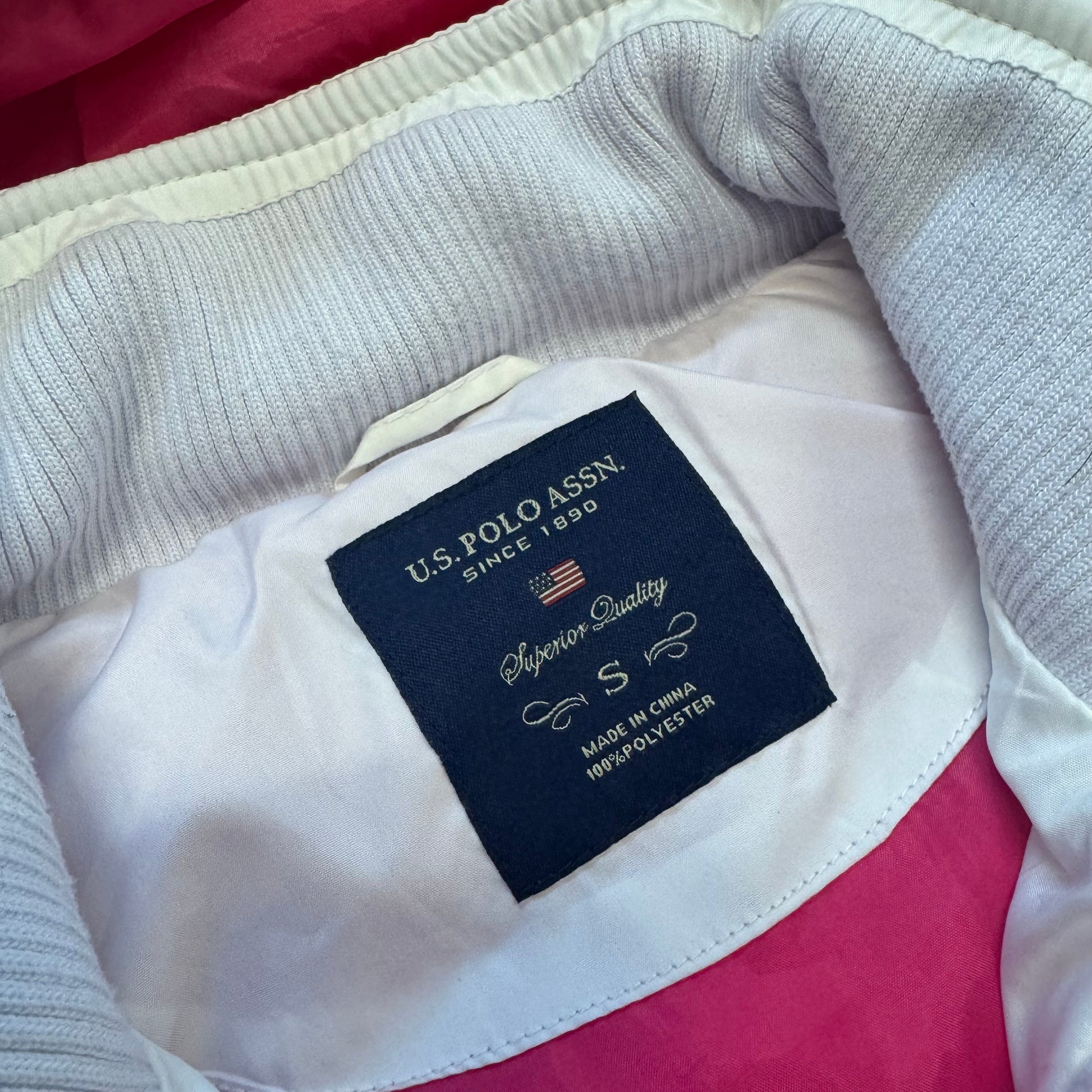 US Polo Assn vintage white puffer vest, this stylish women’s winter vest features a white base with pink details, combining warmth with a classic vintage look. Please note that this item is preowned and shows minor signs of wear consistent with its age. Item is a women’s size S; please refer to the measurements indicated for accuracy.