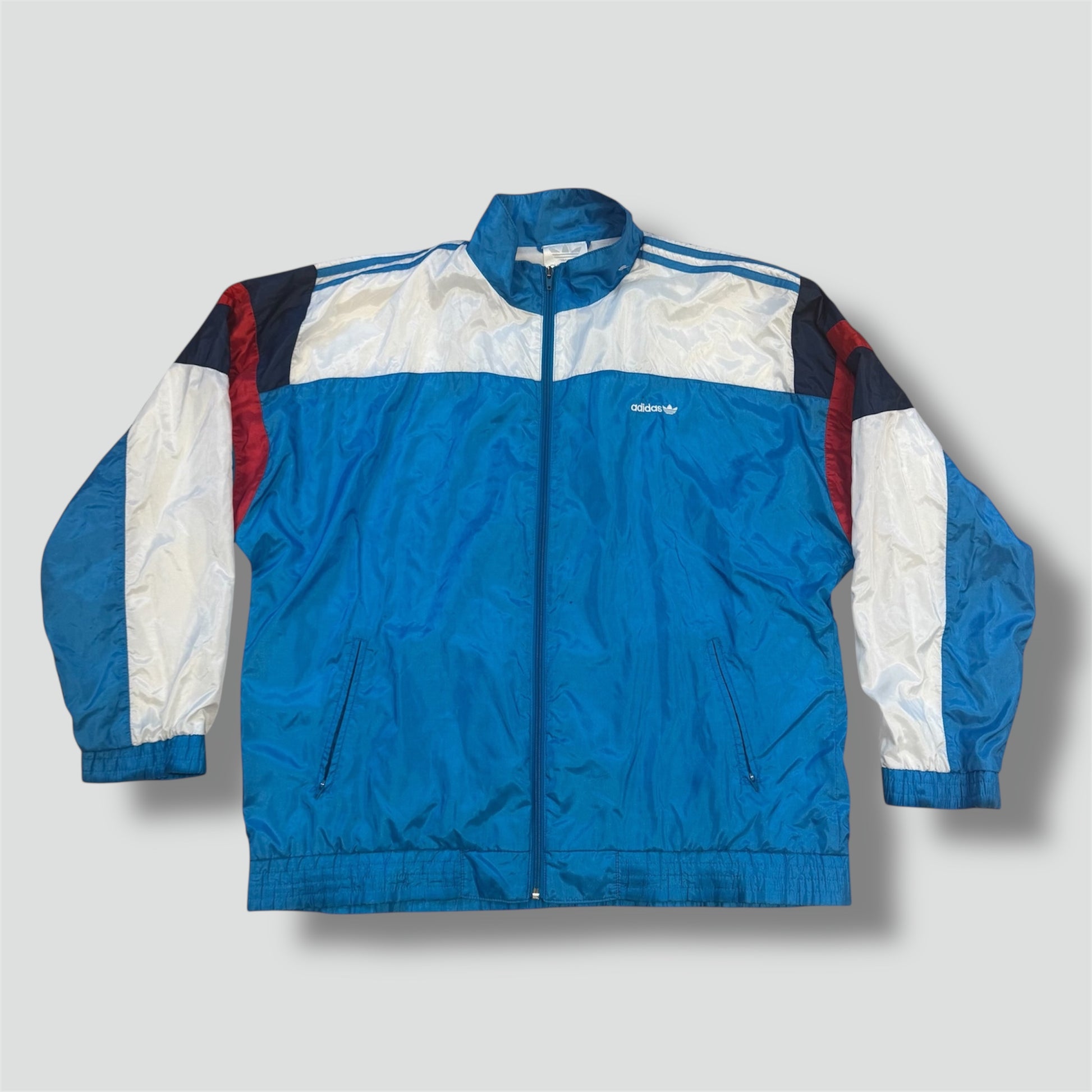 Vintage Adidas oversized skyblue track jacket, this stylish retro rain-protective piece crafted from polyester. please note that this item is preowned and shows clear signs of wear and marks. item is a loose size L, please refer to the measurements for accurate sizing.