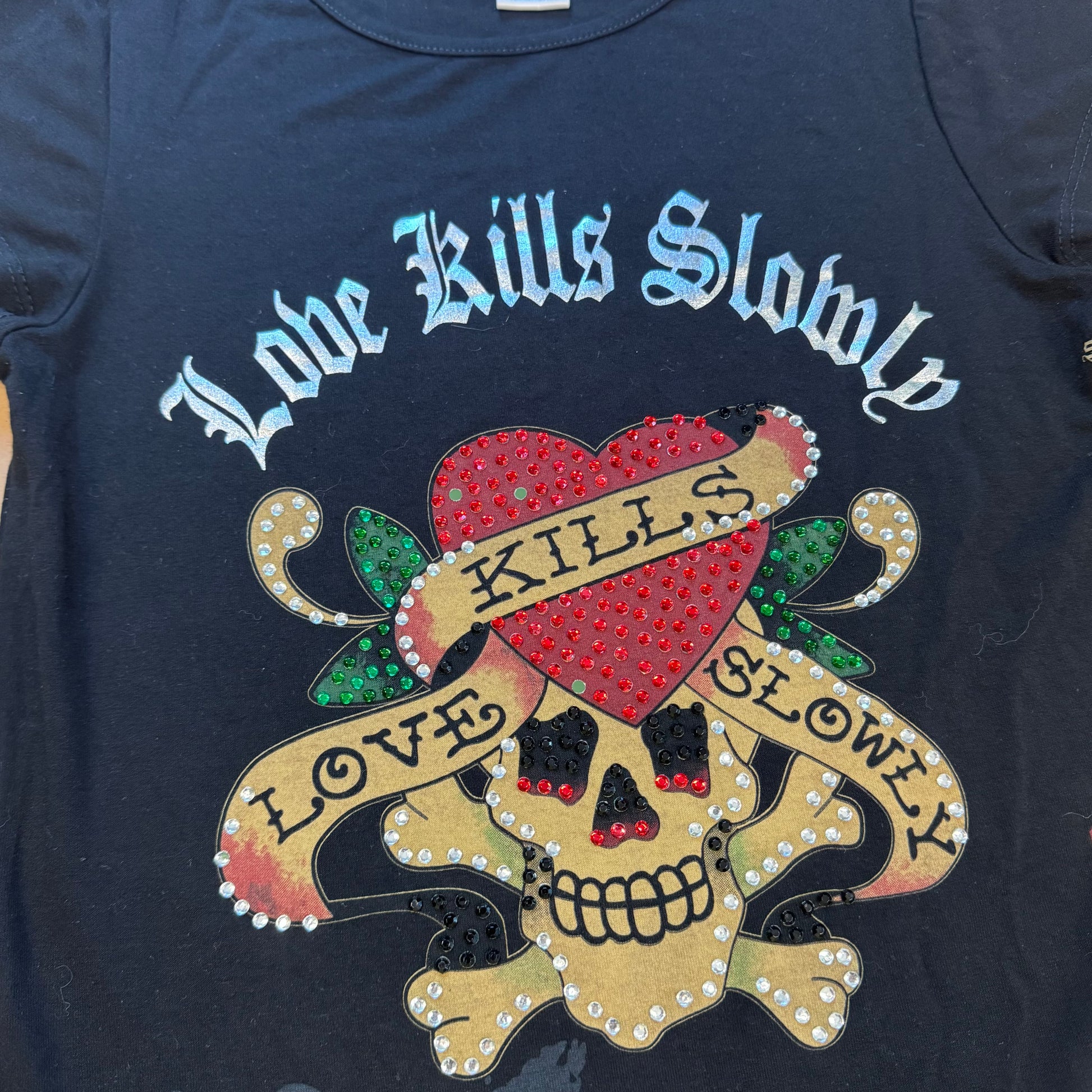 Vintage Ed Hardy long dress with rhinestone details featuring the legendary "Love Kills Slowly" design. This stylish summer piece embodies the bold and iconic Y2K aesthetic of Ed Hardy, combining tattoo-inspired graphics with shimmering rhinestones for a standout look. Please note that this item is preowned and shows minor signs of wear, including a few missing rhinestones. Item is a women's size M, please refer to the measurements for accuracy.