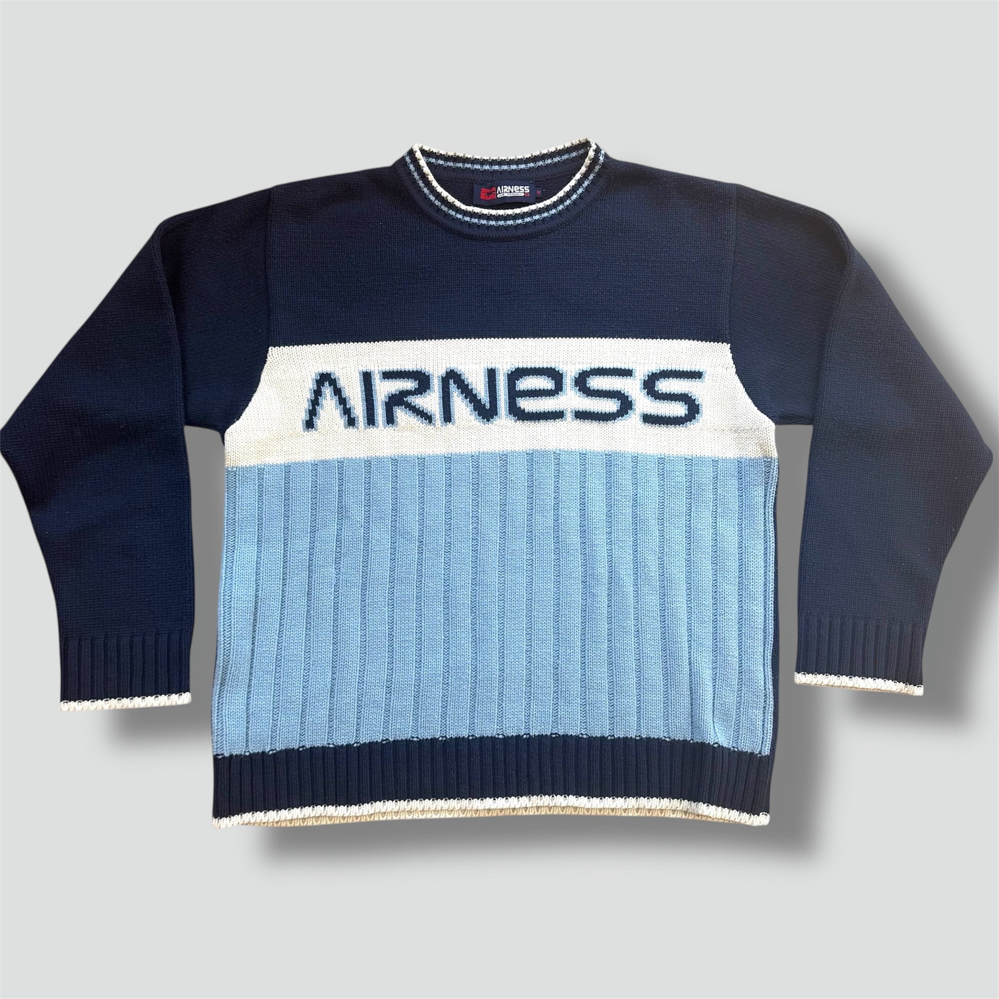 Vintage oversized Airness knitted sweatshirt, this stylish sweater is crafted from warm-keeping cotton and offers a relaxed, streetwear-ready fit perfect for cooler days. Please note that this item is preowned and may show minor signs of wear. Item is a size M, please refer to the measurements indicated for accuracy.