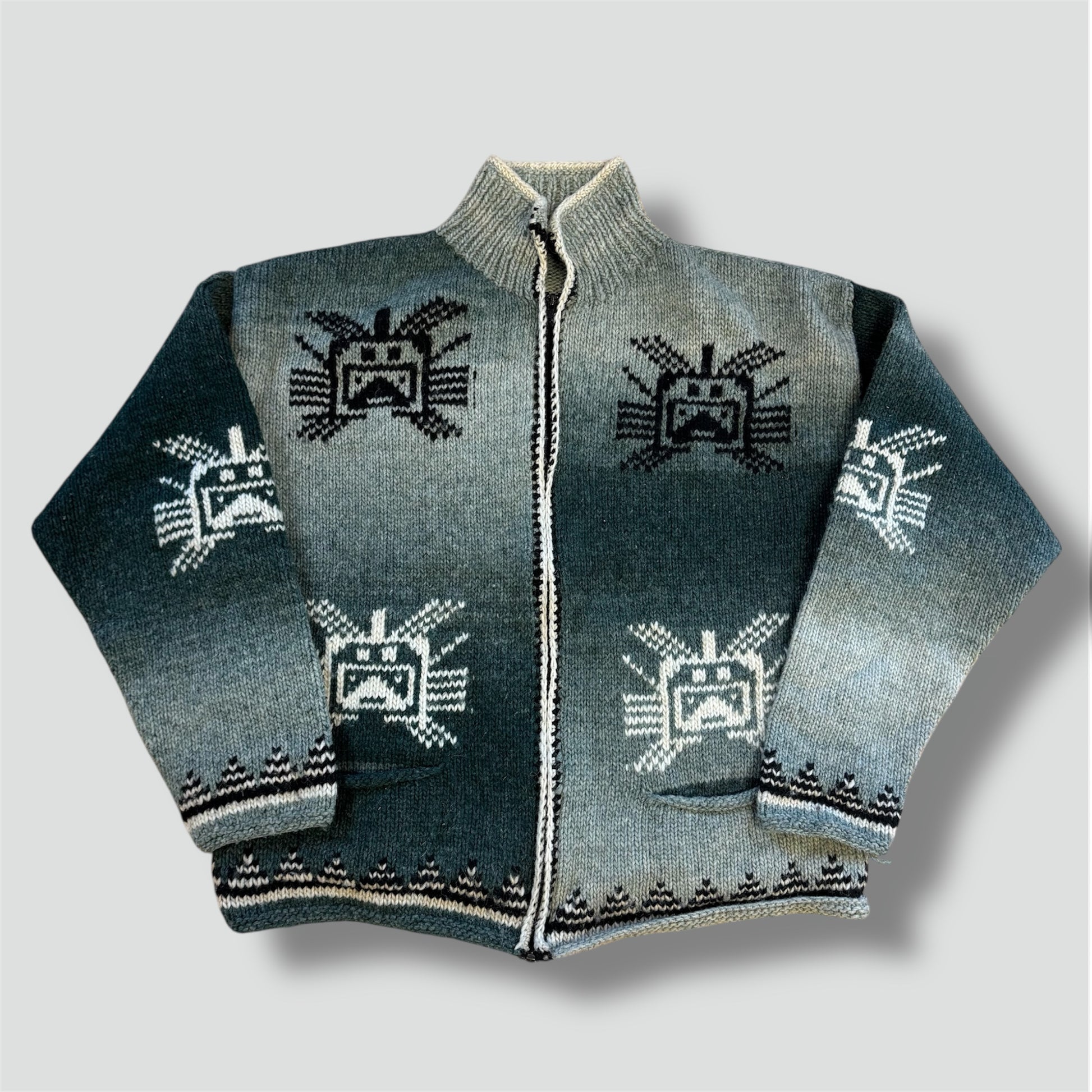 Vintage patterns knitted jacket, this stylish turtleneck zip-up is a classic vintage piece crafted from warm-keeping cotton, perfect for adding a unique retro touch to your wardrobe. Please note that this item is preowned and may show minor signs of wear. Item is a size L, please refer to the measurements indicated for accuracy.